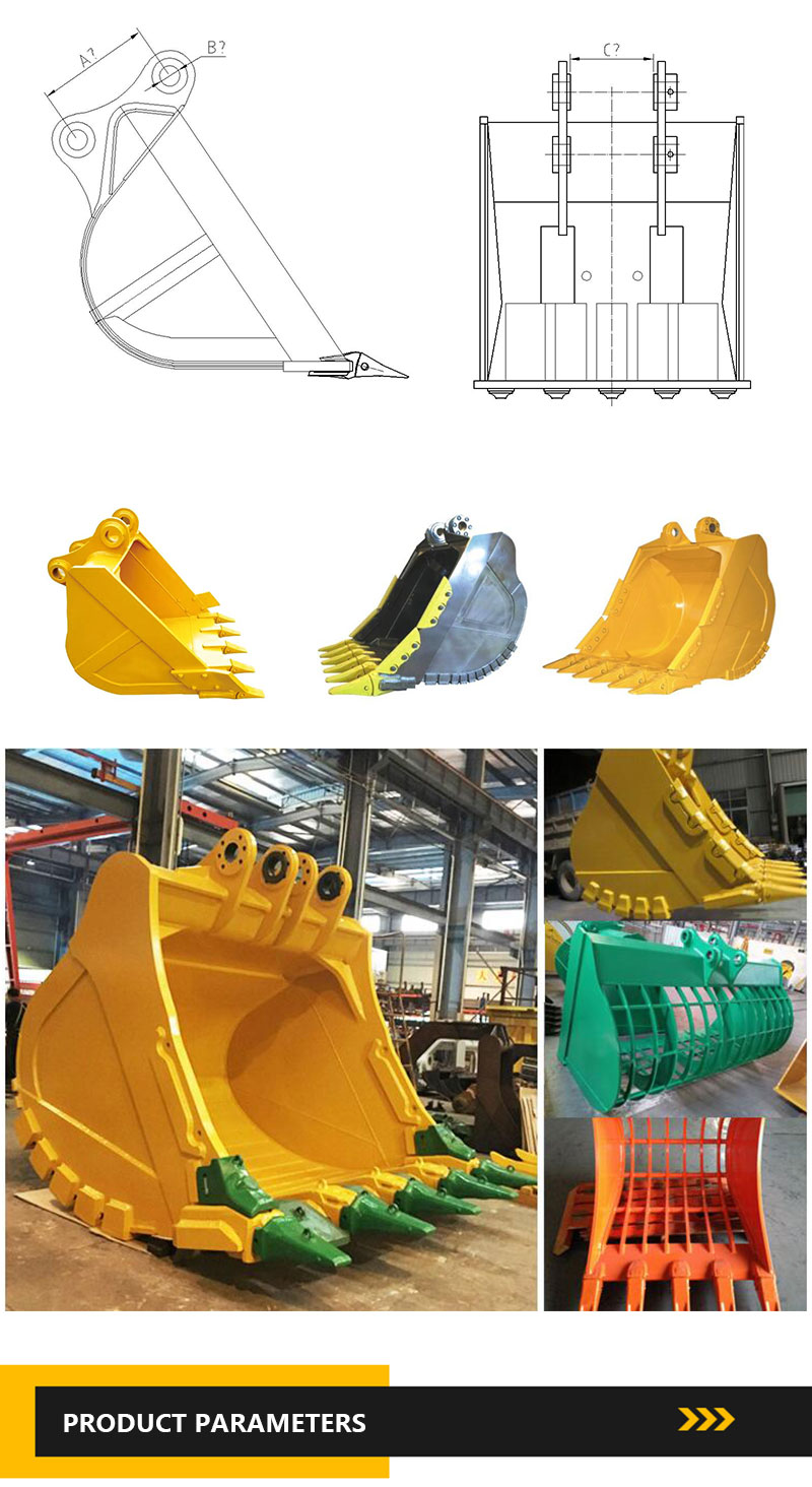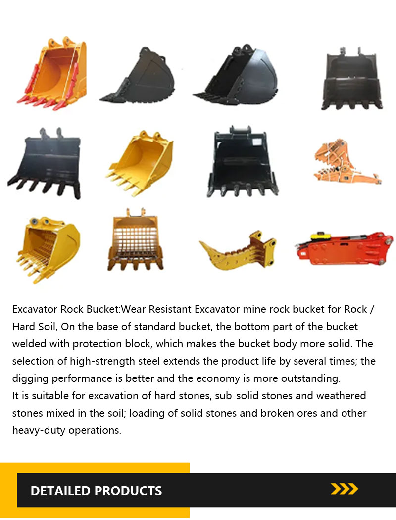Godet à roches pour excavatrice : Godet à roches résistant à l'usure pour sols rocheux et durs. La partie inférieure du godet standard est soudée avec un bloc de protection, ce qui renforce sa solidité. Le choix d'un acier haute résistance prolonge considérablement sa durée de vie, améliore les performances d'excavation et optimise la rentabilité. Il est adapté à l'excavation de roches dures, de roches sous-solides et de roches altérées mélangées au sol, au chargement de roches solides et de minerais concassés, ainsi qu'à d'autres opérations lourdes.