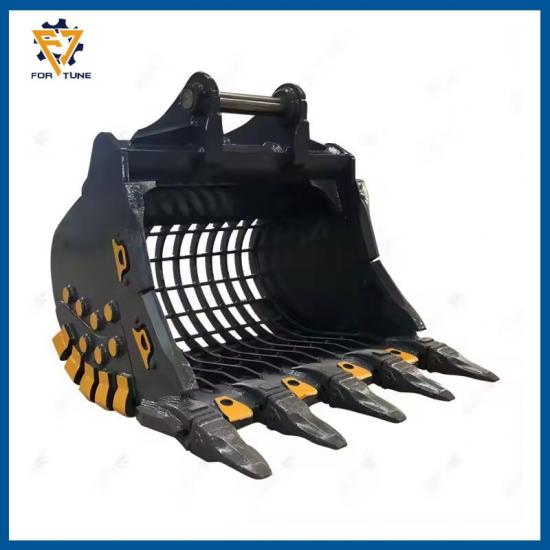 Godet à roches pour excavatrice : Godet à roches résistant à l'usure pour sols rocheux et durs. La partie inférieure du godet standard est soudée avec un bloc de protection, ce qui renforce sa solidité. Le choix d'un acier haute résistance prolonge considérablement sa durée de vie, améliore les performances d'excavation et optimise la rentabilité. Il est adapté à l'excavation de roches dures, de roches sous-solides et de roches altérées mélangées au sol, au chargement de roches solides et de minerais concassés, ainsi qu'à d'autres opérations lourdes.